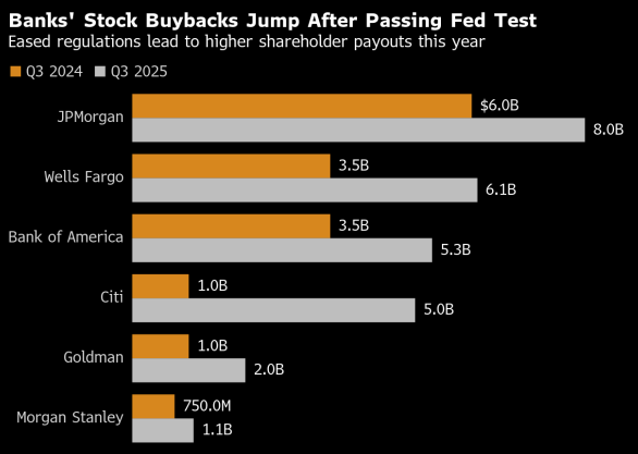 随着监管机构着手放宽强化补充性杠杆率要求,并放松年度压力测试的部分限制,大型银行在向股东返还利润方面已展现出更强信心。美国六大银行第三季度股票回购规模已激增75%,总额突破270亿美元。而且新方案重新修订了市场风险的评估方法,使得拥有庞大交易业务的银行资本压力显著下降。